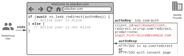 Once a victim visits the malicious website, the attacker must initially guess an (SP, IdP) pair that the victim most likely gave consent to, i.e., that causes the IdP in the `prompt=none` flow to return a redirect to `sp.com/redirect`. The attacker can use the account leakage attack to determine such a pair by testing the most-popular SPs and IdPs. Then, a new Authentication Request is created, and the `login_hint` parameter is set to the email address of the victim, i.e., `alice@example.com`. The attacker sends the Fetch request and determines whether the IdP returns an `HTTP/302` redirect or an `HTTP/200` response. If a redirect was performed, the attacker knows that the Authentication Request was valid, and thus the victim is `alice@example.com`. If no redirect was performed, the victim is not `alice@example.com`. The success of this attack depends on whether the attacker can guess (or eventually knows) an (SP, IdP) pair that the targeted victim gave consent to.